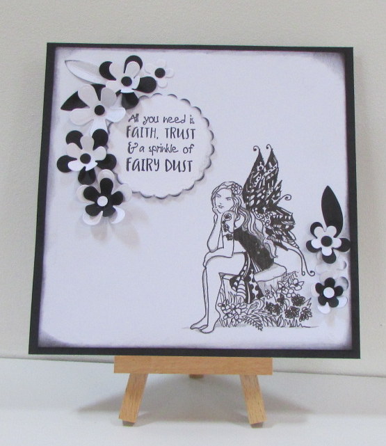 I printed the image onto card and used a fineliner to give it a zentangled look. The flowers were made using an XCUT die with black and white paper. The sentiment was stamped and diecut before being edged in Black Soot Distress ink. To make the card stand out I edged the whole piece with the Distress Ink before mounting onto card.